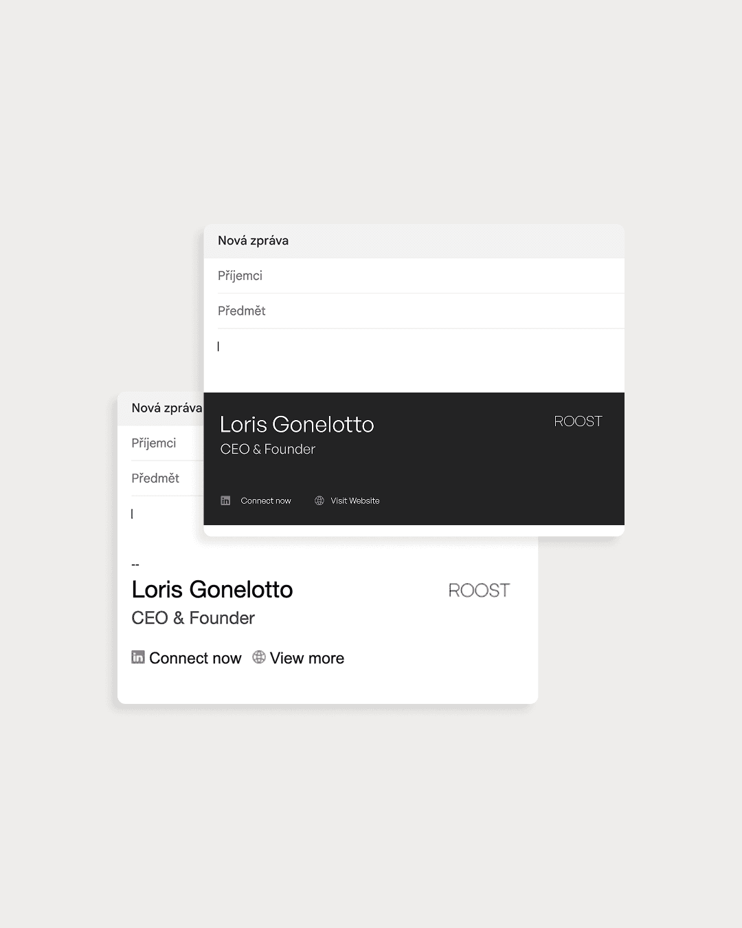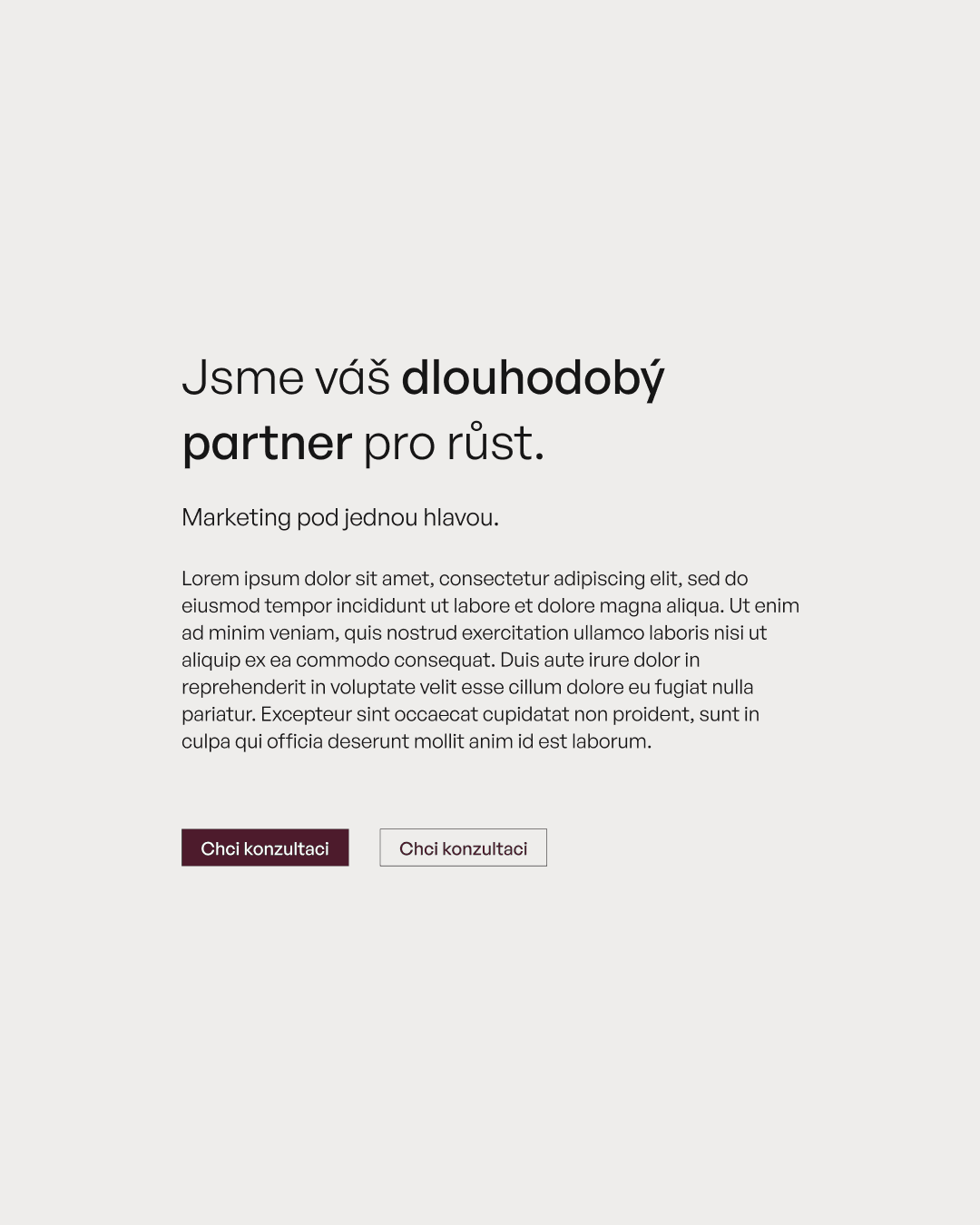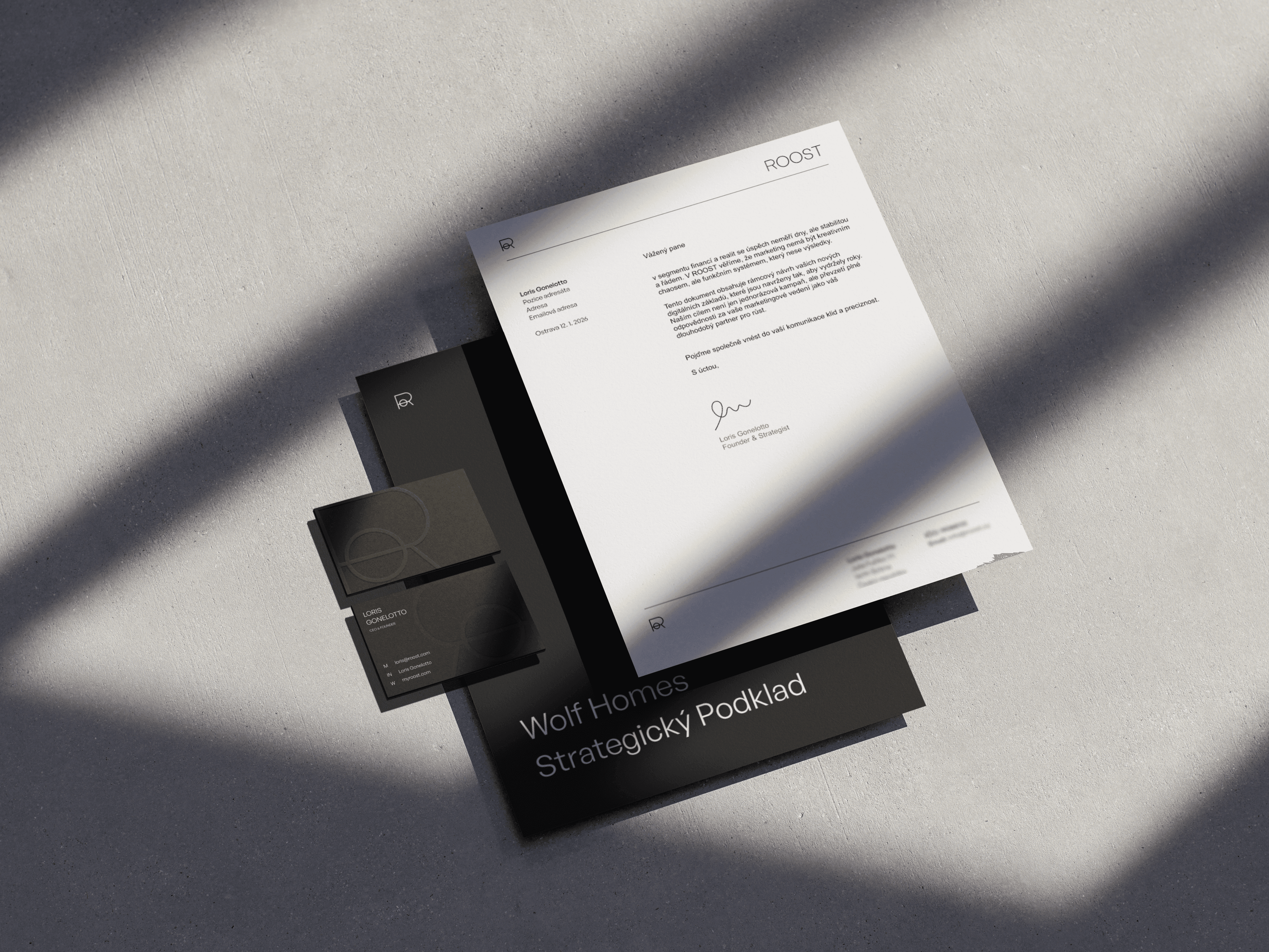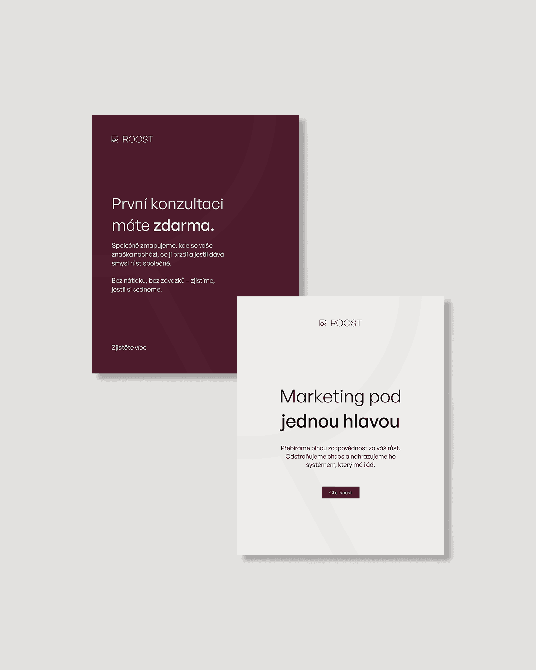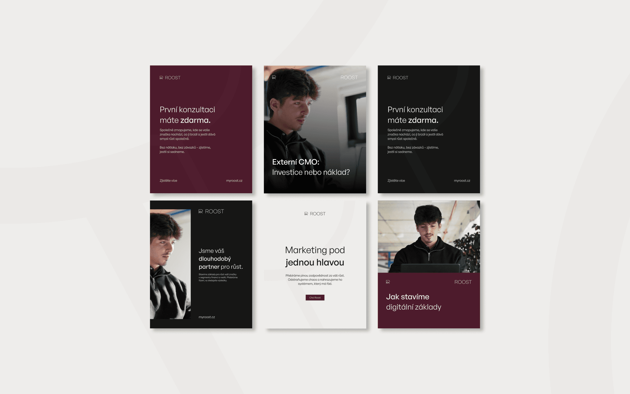 V marketingu je modrá s hravými barvami standard. Roost šel opačným směrem. Naprostý minimalismus, černobílá paleta doplněná o burgundy - barvu která v segmentu financí a realit komunikuje váhu a důvěryhodnost, aniž by o ni musela bojovat.