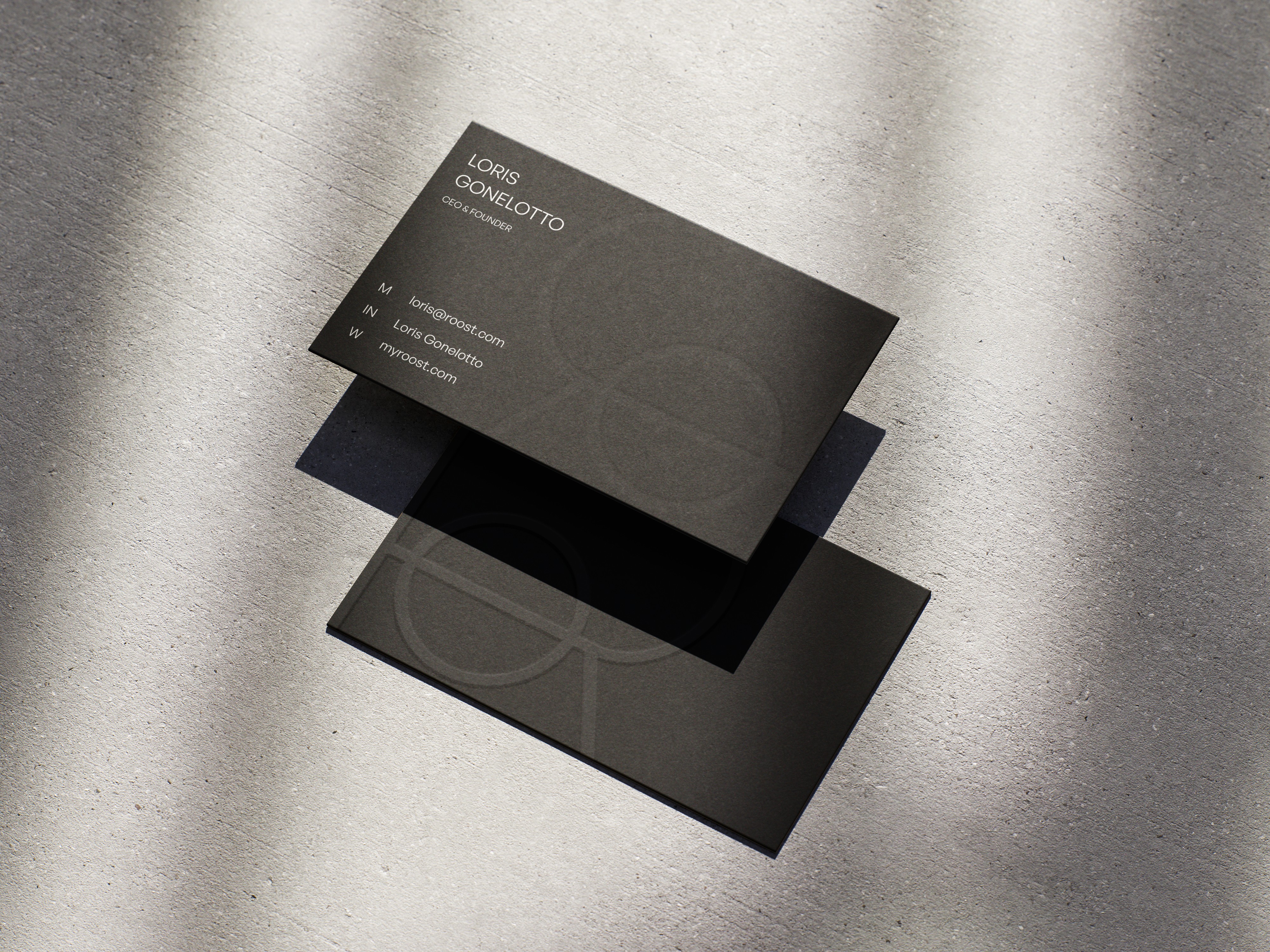 Základem loga je monogram, kde se R a O slévají do jednoho celku. Protnutí dvou písmen symbolizuje model za kterým Roost stojí - experti z různých oborů, jeden tým, jedna hlava. O uprostřed odkazuje na pevné jádro systému, kolem kterého Roost staví celý marketing svých klientů.