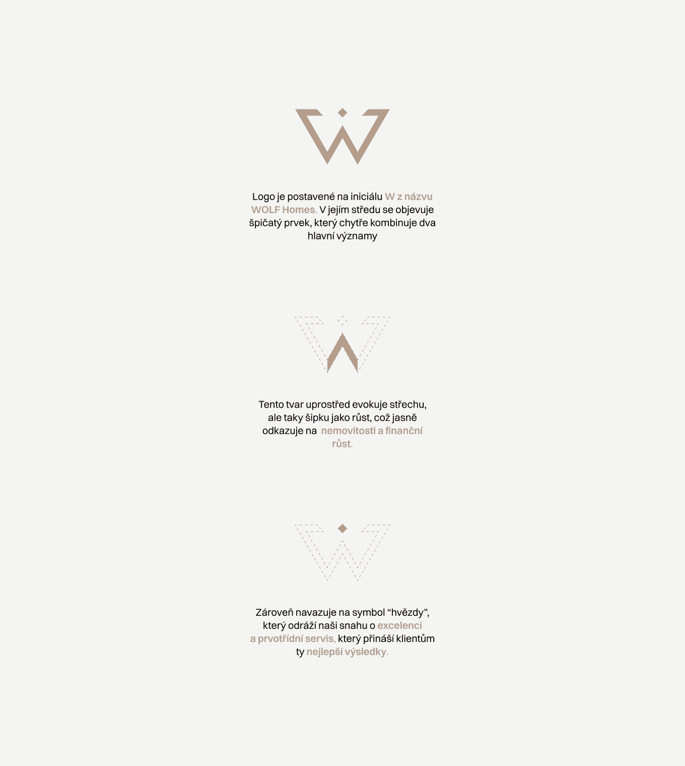 Logo stojí na klíčových slovech značky nemovitosti, růst a hodnotě exkluzivity. Barevná paleta kombinuje čistotu, eleganci a kontrast. Vybrané písmo podporuje lidský přístup.